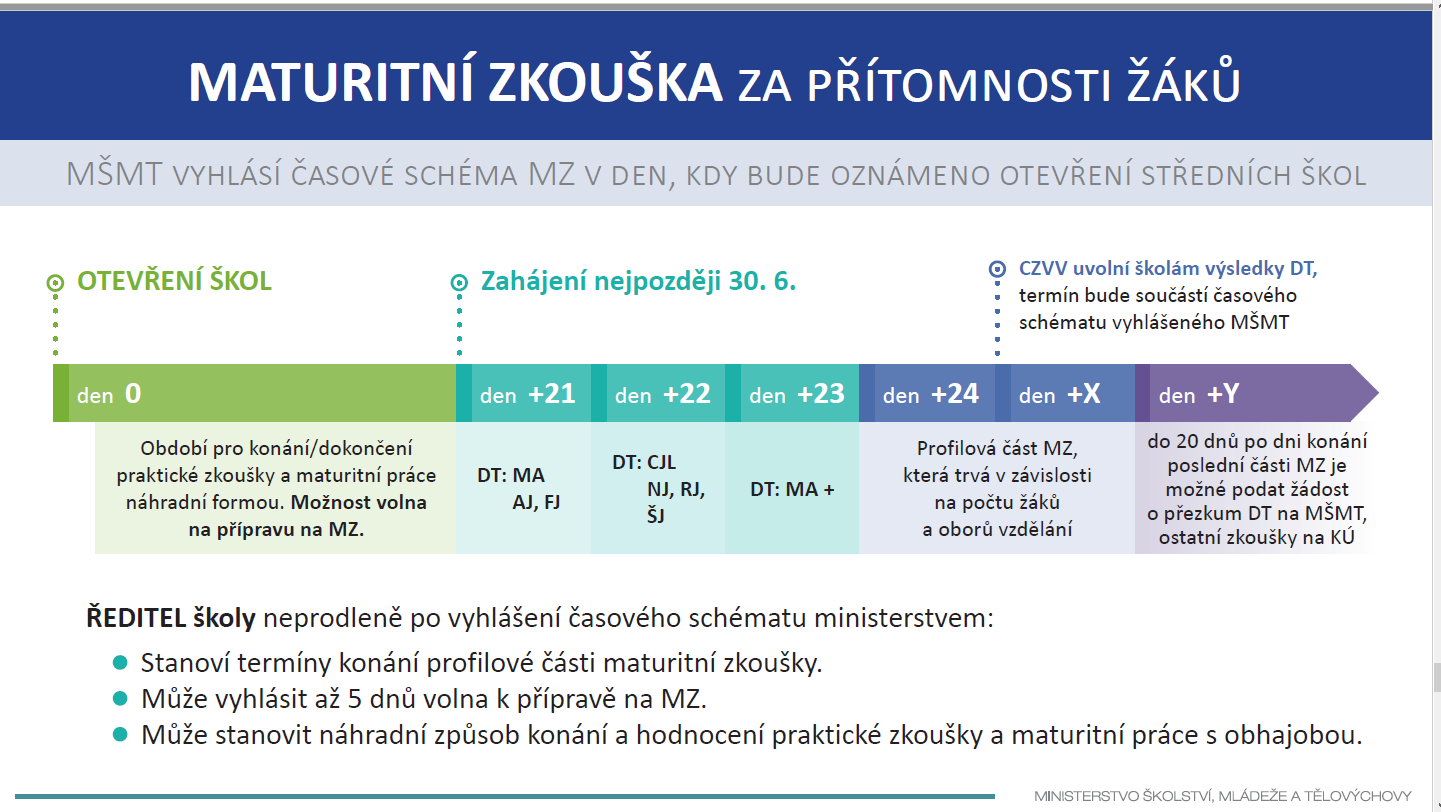 Informace pro žáky a jejich rodiče: Výuka v nematuritních ročnících Pokračuje pouze distančně až do 30. června 2020. Co se týká hodnocení (uzavření klasifikace) – čekáme na manuál (prováděcí předpis) MŠMT. Výuka v maturitních ročnících 1) Výuka a závěrečné hodnocení budou ukončeny podle předmětů - nematuritní předměty do 30. dubna 2020, - maturitní předměty po ukončení konzultací do pátku 22. 5. 2020, kdy proběhne pedagogická rada ("klasifikační porada"). 2) Svatý týden bude od 25. 5.–29. 5. 2020. celý článek
