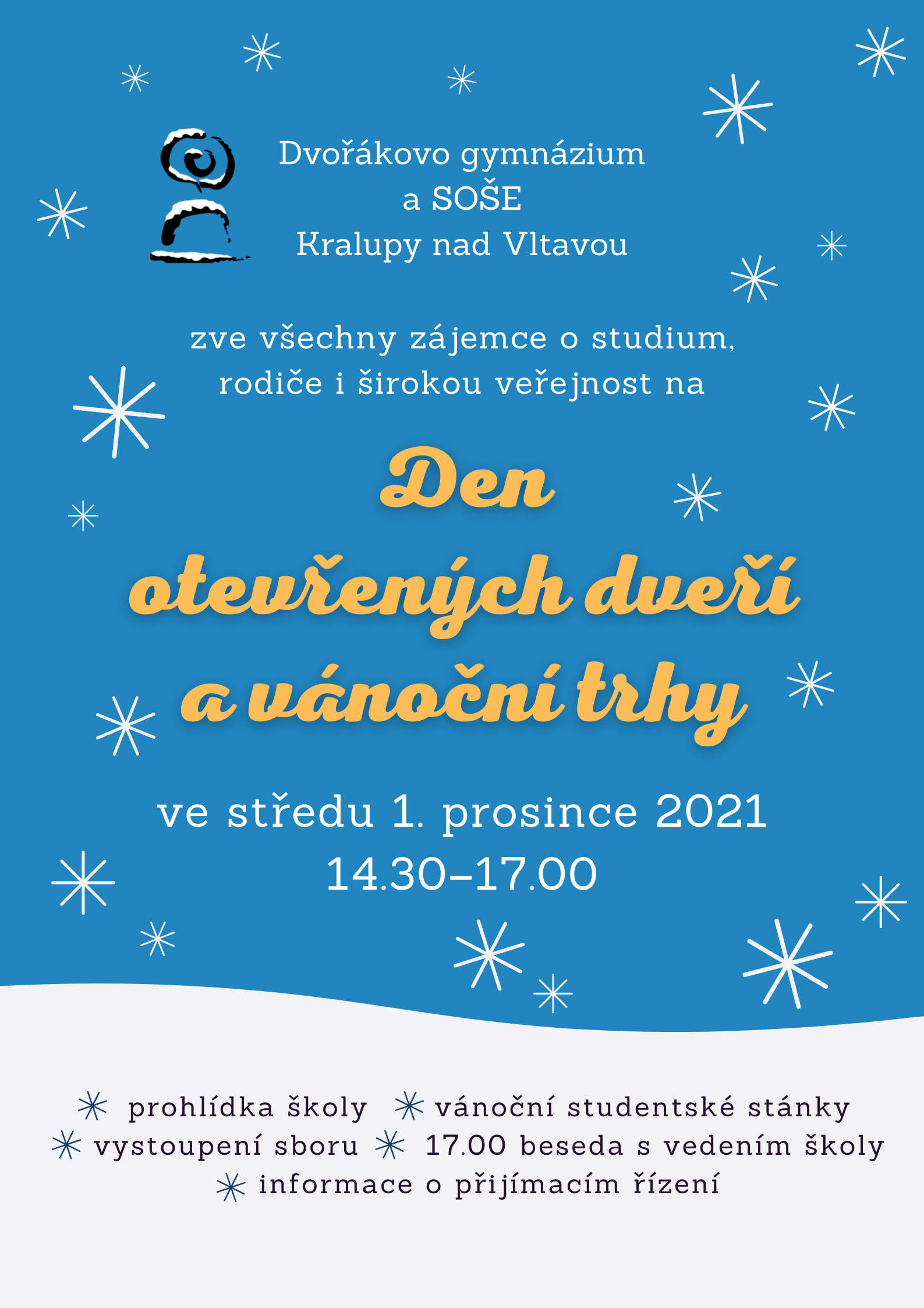 Den otevřených dveří se koná ve středu 30. listopadu 2022 od 14.30 do 17.00 hodin. Na akci zveme kralupskou veřejnost i všechny zájemce o studium na naší škole - přijďte si prohlédnout učebny, pohovořit s učiteli i žáky. V 17.00 se koná v suterénu v hudebně beseda o studiu s vedením školy. Na předvánoční atmosféru Vás naladí úvodní koncert Sboru DG i studentské vánoční trhy, kde můžete zakoupit zajímavé dárky vyrobené našimi studenty. Těšíme se na budoucí studenty, ale i absolventy či rodiče našich žáků! celý článek