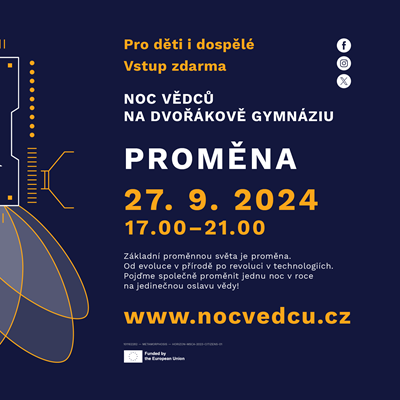 Milí studenti, rodiče a přátelé vědy, srdečně vás zveme na letošní Noc vědců, která se uskuteční v pátek 27. září 2024 od 17:00 do 21:00 na našem gymnáziu. Tématem letošního ročníku je "Proměna". Program je již zveřejněn! celý článek