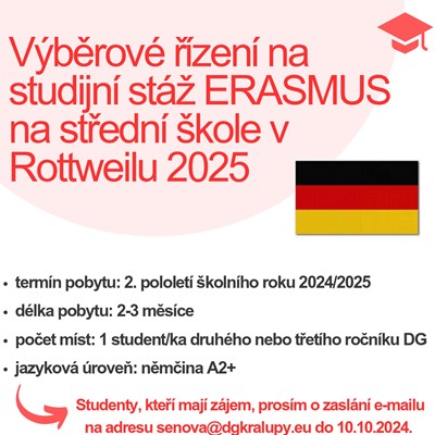Otevíráme výběrové řízení na 1 místo na studijní stáž Erasmus na střední škole v německém Rottweilu na jaro 2025. celý článek