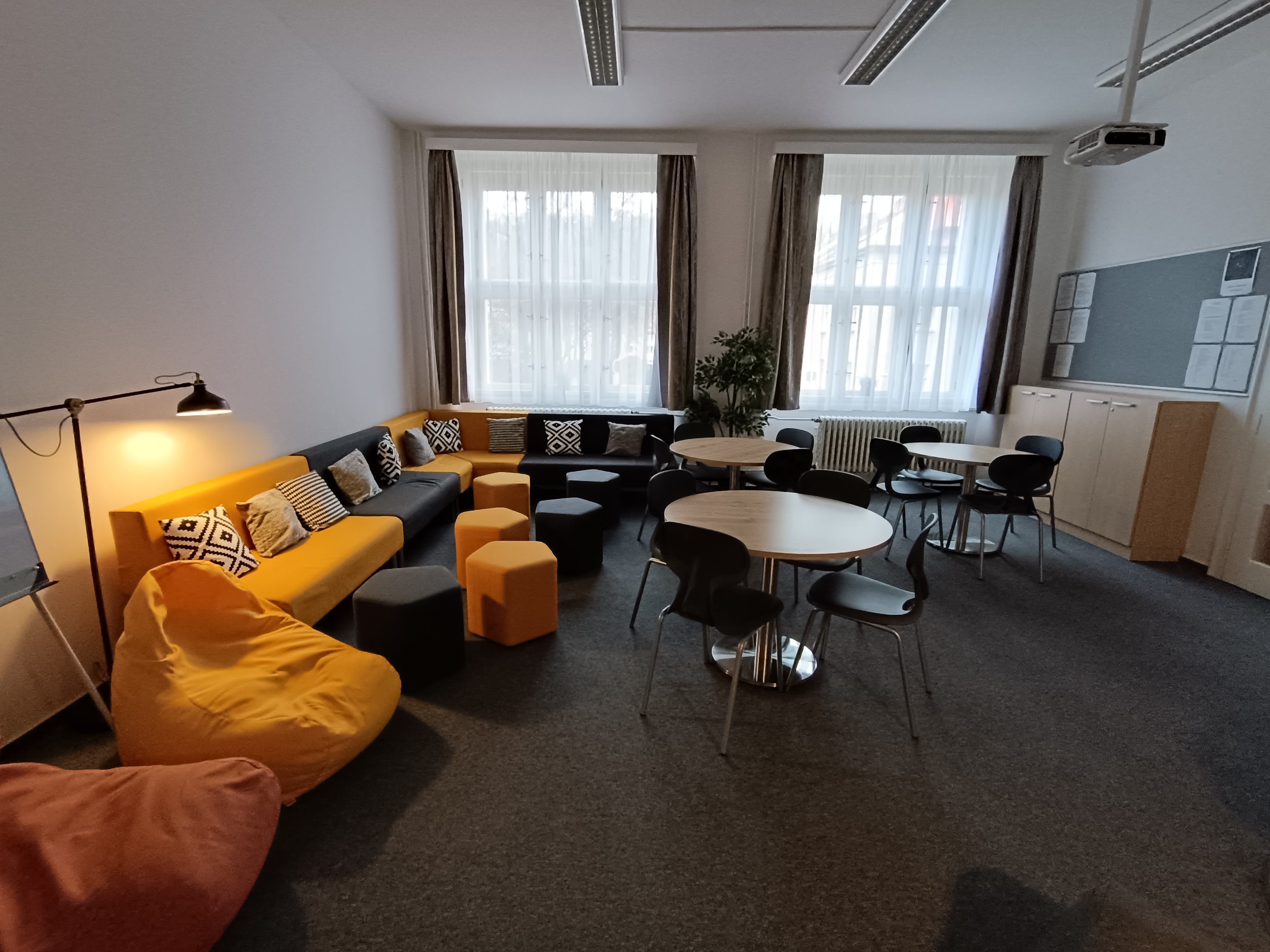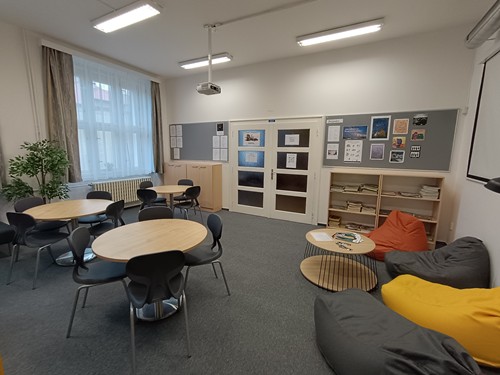 Do tohoto prostoru bylo v rámci dotačního programu Středočeského kraje Zavádění inovativních metod do výuky investováno zhruba 850 000 Kč. Tato částka nám umožnila zcela zrekonstruovat prostory studovny, které byly vymalovány a vybaveny pohodlným novým nábytkem a IT vybavením, novým kobercem, záclonami a závěsy, nástěnkami a osvětlením. Podařilo se nám vytvořit útulný a moderně vybavený prostor, ve kterém tráví své volné chvíle stále více a více studentů.