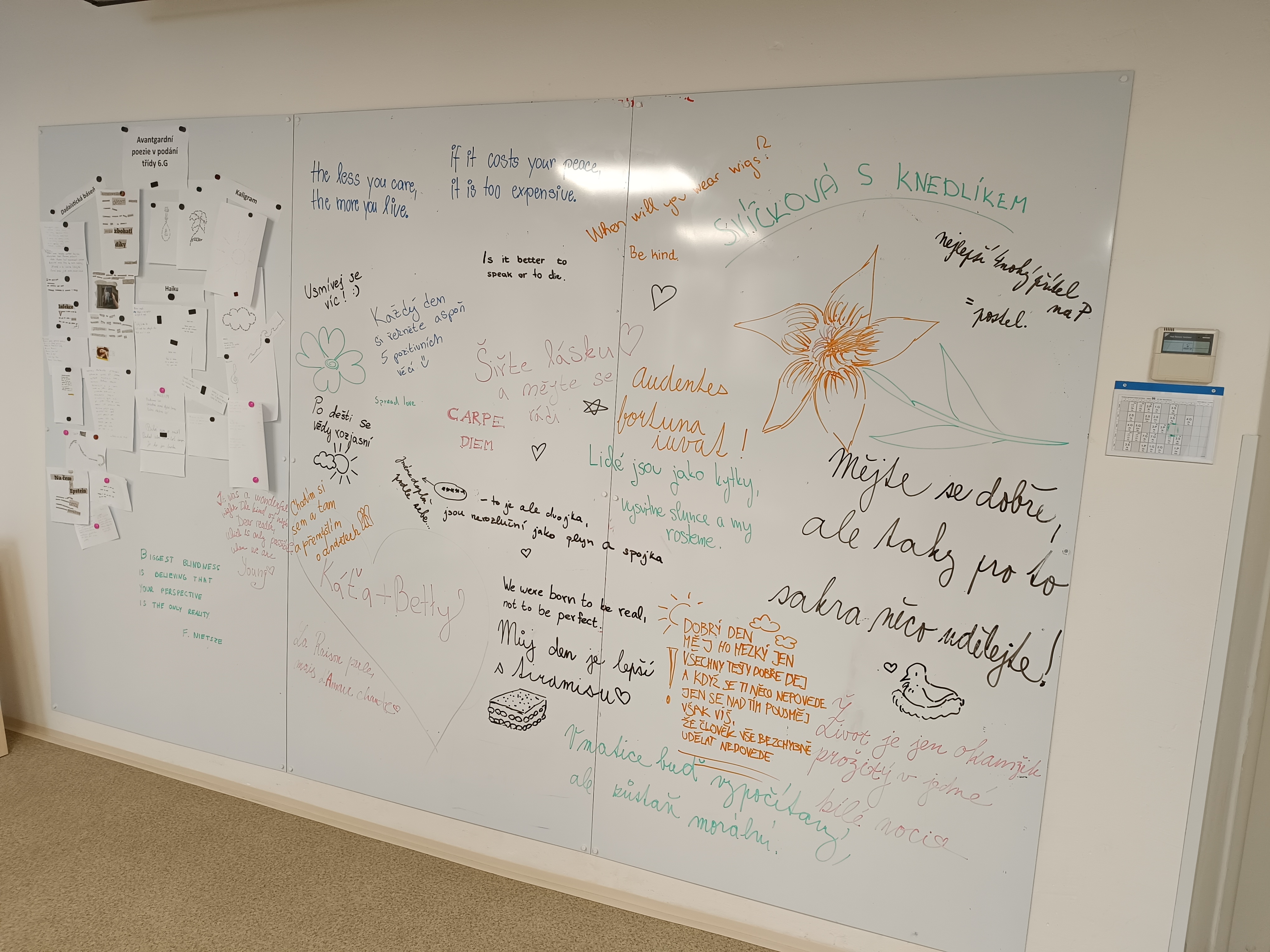Zmodernizovat se podařilo i prostory chodby v areálu českého jazyka, do kterého byly kromě nové podlahové krytiny a úložných prostor nainstalovány velké popisovatelné panely, které již od začátku školního roku slouží vyučujícím literatury a jejich studentům k tvůrčí realizaci.