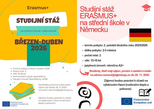 Nabízíme příležitost individuálních studijních stáží Erasmus pro studenty Dvořákova gymnázia na partnerské střední škole ve španělské Barceloně a v Německu. Stáž jsou jsou plně hrazeny z prostředků Evropské Unie. Přihlašování probíhá do 26. 11 a 28. 11. respektive.