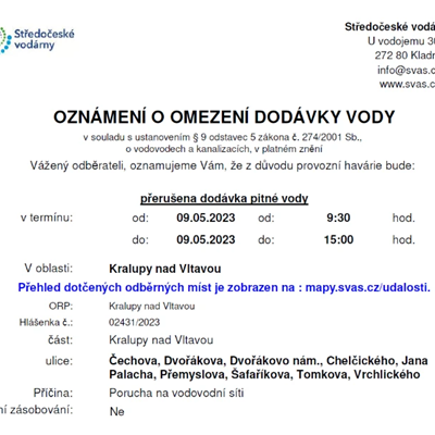 Informace o havárii vody 9. 5. 2023