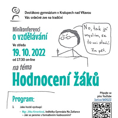 Vážení rodiče, milé studentky, milí studenti, opět po roce Vás chci pozvat na tradiční podzimní akci naší školy, jíž je minikonference o vzdělávání, která se koná ve středu 19.10. 2022 od 17:30. Celá akce proběhne distančním způsobem. To však doufám nevadí, neboť tento způsob v sobě skrývá nemalou výhodu – účast na minikonferenci v pohodlí Vašich domovů. Tématem letošního setkání jsou Hodnocení žáků. celý článek