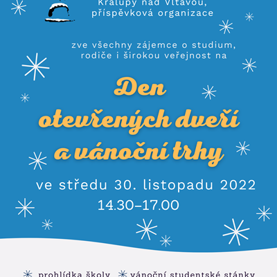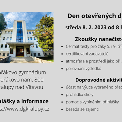 Den otevřených dveří se koná ve středu 30. listopadu 2022 od 14.30 do 17.00 hodin. Na akci zveme kralupskou veřejnost i všechny zájemce o studium na naší škole - přijďte si prohlédnout učebny, pohovořit s učiteli i žáky. V 17.00 se koná v suterénu v hudebně beseda o studiu s vedením školy. Na předvánoční atmosféru Vás naladí úvodní koncert Sboru DG i studentské vánoční trhy, kde můžete zakoupit zajímavé dárky vyrobené našimi studenty. Těšíme se na budoucí studenty, ale i absolventy či rodiče našich žáků! celý článek