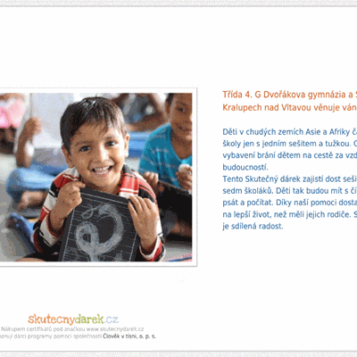Vánoční dobrý skutek Letošní Vánoce proběhla ve třídě 2.A sbírka na podporu dětského domova v Kralupech nad Vltavou. S návrhem na podílení se na financování sponzorského daru (v podobě vánočního cukroví pro celý dětský domov) celá třída souhlasila a vybráno bylo něco přes 1000 korun. Dohromady i s příspěvky dalších dvou dobročinných sponzorů, a také třídní paní profesorky Renaty Novákové, tak bude dětskému domovu darováno přes 3 kg cukroví. I zdánlivá drobnost dokáže pomoct tolika lidem. - 2.A celý článek
