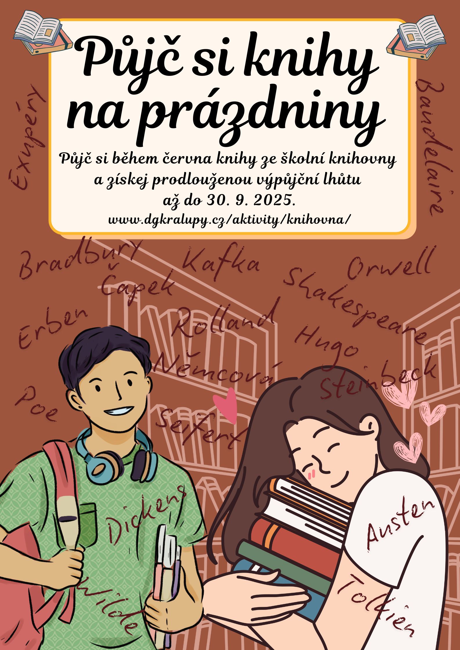 Milé čtenářky, milí čtenáři, poslední měsíc školního roku je tady a s ním opět akce školní knihovny Půjč si knihy na prázdniny, protože kdy jindy je ideální doba na to přečíst si knížku jen tak pro radost nebo si udělat náskok s maturitní četbou, než právě o letních prázdninách. Školní knihovna nabízí kompletní nabídku knih z okruhu maturitní četby. Kromě kánonových knih si můžete vybrat z velmi pestré nabídky knih nejrůznějších žánrů od fantasy, dystopie a sci-fi, přes dívčí romány, dobrodružné knihy a knihy s historickým tématem, až po komiksy a spoustu dalšího. Nabídka je opravdu široká (více než 5 000 svazků) a každý si určitě vybere. Kompletní nabídku knih naleznete v online katalogu školní knihovny na https://skola.tritius.cz/library/dgkralupy/ Pokud si knihy půjčíte v průběhu června, získáte automaticky prodlouženou výpůjční lhůtu přes celé letní prázdniny až do 30. 9. 2025. Nemusíte tak řešit prodlužování a knihy pohodlně vrátíte až v novém školním roce. Knihy si je možné přijít po předchozí písemné domluvě půjčit i mimo běžnou půjčovní dobu, případně i během letních prázdnin. Pokud byste si chtěli knihy vybrat v klidu předem a pak si je jen přijít vyzvednout, můžete v rámci svého čtenářského konta využít rezervaci knih, které na vás následně budou čekat připravené ve školní knihovně. Návod naleznete v dokumentu Návod na nastavení čtenářského konta na stránkách školní knihovny na https://www.dgkralupy.cz/aktivity/knihovna/ V případě jakýchkoliv dotazů se na mne neváhejte obrátit a nezapomeňte se před odchodem na prázdniny zásobit knihami 🙂 celý článek