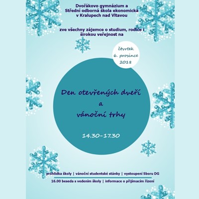 Den otevřených dveří se koná ve čtvrtek 6.12.2018 od 14.30 do 17.30. Na akci zveme všechny zájemce o studium na naší škole - přijďte si prohlédnout učebny, pohovořit s žáky i učiteli, v 16.00 se koná beseda o studiu s vedením školy. Předvánoční období vám připomenou studentské vánoční trhy a koncert Sboru DG. Těšíme se na budoucí studenty, ale i absolventy či rodiče našich žáků! celý článek
