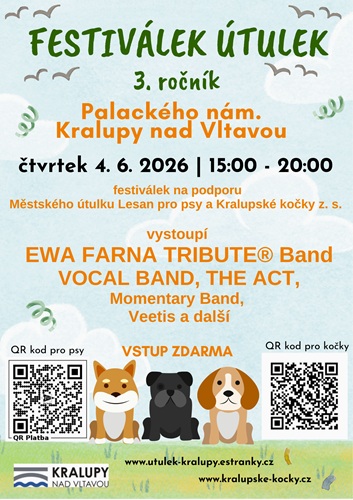 Srdečně zveme na 3. ročník charitativního festiválku, který podporuje kralupské útulky pro psy a kočky. Koná se ve čtvrtek 4. 6. od 15:00 do 20:00 na Palackého náměstí v Kralupech nad Vltavou. Vystupují studenti, absolventi a učitelé Dvořákova gymnázia. Jako host vystoupí EWA FARNA Tribute Band a student pražské mezinárodní konzervatoře Milan Horváth. Vstup na akci je zdarma.