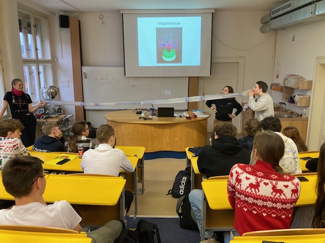 Fyzika všemi smysly. Dne 17. prosince k nám zavítaly studentky z Matematicko-fyzikální fakulty Karlovy univerzity, aby našim žákům představily zajímavou a netradiční vzdělávací akci s názvem „Fyzika všemi smysly“. Během programu měli studenti možnost objevovat fyzikální jevy prostřednictvím vlastního prožitku, experimentování a multisenzorických aktivit.