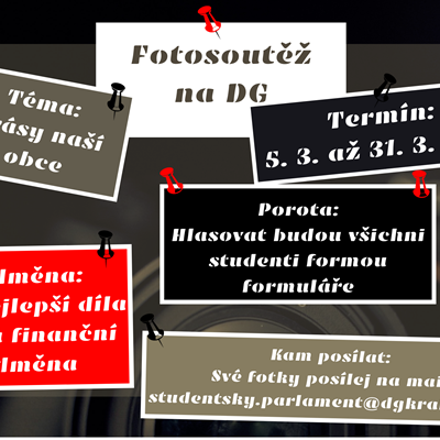 Ahoj, už je to rok, co jsme v této dost náročné situaci. Nic se od března téměř nezměnilo. Všichni sedíme skoro celý den u počítačů, máme online výuku a když máme chvíli klidu, vrháme se na domácí úkoly. Ven se nám k večeru kolikrát už nechce a tak se radši lehneme a pustíme si seriál. Proto jsme pro studenty připravili FOTOSOUTĚŽ. Během soutěže se dostaneme ven na čerstvý vzduch a díky tématu budeme dodržovat vládní opatření. Tématem soutěže jsou „Krásy naší obce“. Jak soutěž pojmete, je jen na Vás. Dodržujme ale téma a fotku pořiďme nejlépe v obci, kde bydlíme. Každý student může poslat jen 2 výtvory, a tak pečlivě vyber mezi svými fotkami. Své fotky pak posílejte na email studentského parlamentu (studentsky.parlament@dgkralupy.eu) . Své fotky prosím odevzdávejte do 31. 3. 2021. celý článek
