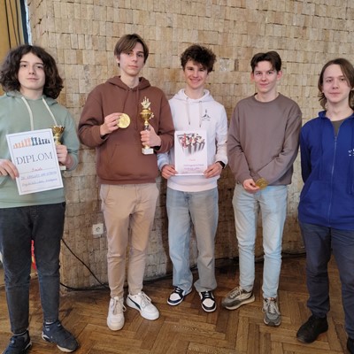 Družstvo Dvořákova gymnázia získalo na Mistrovství České republiky školních týmů v šachu 2025 mezi nejlepšími 32 týmy z celé republiky stříbrné medaile. Přitom vítěze z Frýdku-Místku ve vzájemném utkání naše družstvo porazilo, o konečném pořadí však rozhodlo to, že mistrovské družstvo během celého turnaje nasbíralo o 1,5 bodu více než družstvo kralupské. celý článek