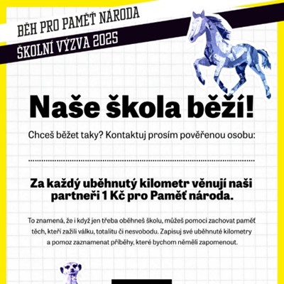 Připojili jsme se k běžecké výzvě Běh pro paměť národa pro základní a střední školy. Běháme od 16.5. kde se dá, po polňačkách, na asfaltkách, po oválu, podél Vltavy, ve veltruském zámeckém parku, na Šumavě, v Českém středohoří i na Erasmu ve Francii a Německu. A co to z toho? celý článek