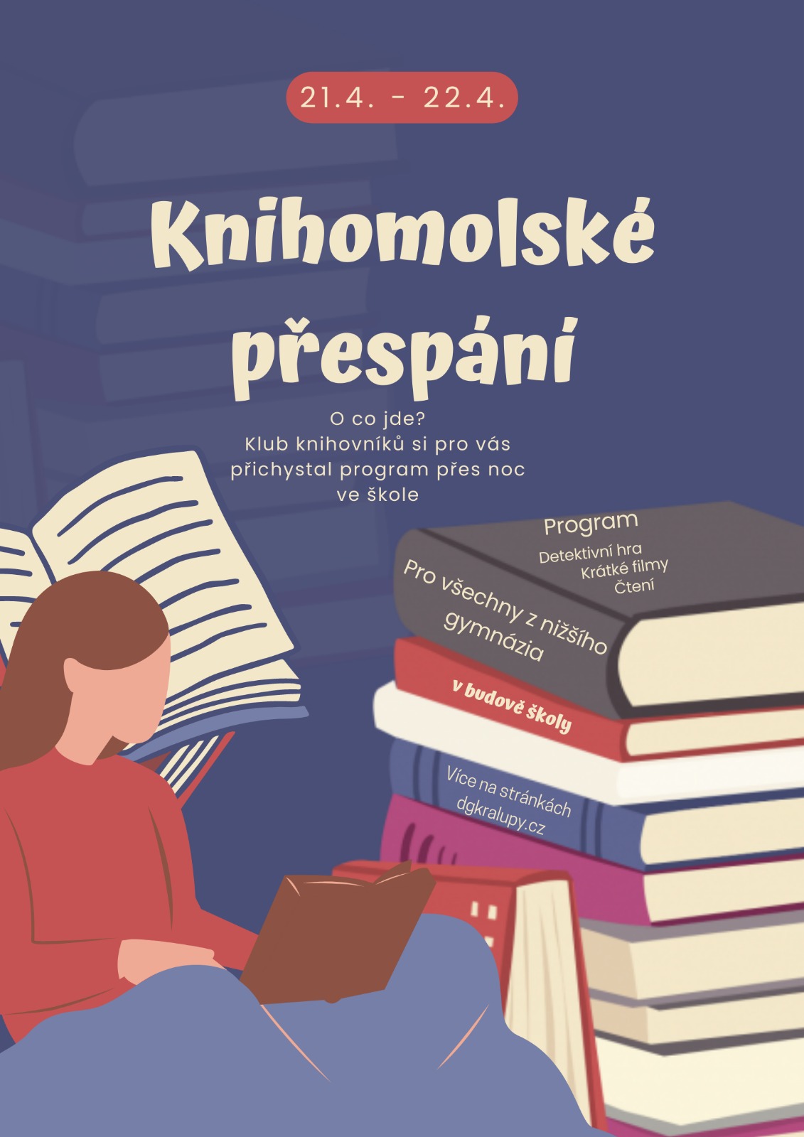 Máš rád hry v terénu s detektivní zápletkou? Chceš vidět krátké filmy svých spolužáků? Něco si přečíst nebo poslechnout? A máš volno 21. dubna? Tak se přihlas a přijď na přespání do školy, které pořádají knihomolové ze 4. G. celý článek