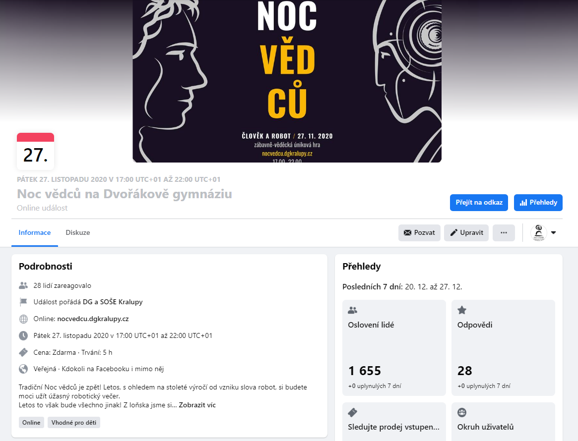 Dnes je to právě měsíc, co se naše škola účastnila akce Noc vědců nocvedcu.cz Pojďme si zavzpomínat... Přípravy na akci začaly již na jaře 2020 - to se ještě počítalo s termínem 25. září a osobní účastní návštěvníků, v červnu se konala konference zástupců organizátorů - termín se kvůli účasti v projektu posunul na 27. listopadu a stále se připravovala stanoviště s pokusy a workshopy. Během září padlo rozhodnutí o online verzi programu a vznikl nápad na únikovou hru, ve které se propojí příběh o naší škole se stanovišti s robotickou tematikou. V říjnu se velmi intenzivně pracovalo a v půlce listopadu jsme již testovali hru na webu. V pátek 27. 11. v 17.00 jsme s napětím očekávali návštěvníky. Vše naplánované jsme včas stihli a splnili, za což patří obrovské poděkování všem, kteří se na akci podíleli. celý článek