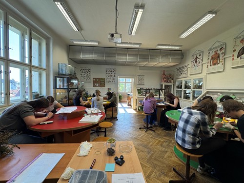 Studenti 3. ročníků v rámci biologického semináře zkoumali vývržky kalouse ušatého. Vývržky rozebrali a roztřídili nalezené části, zejména lebky a kosti, podle kterých lze určit druhy ulovených živočichů.