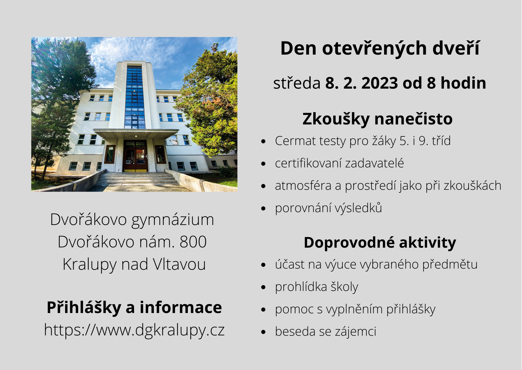 Akce již proběhla, výsledky naleznete v příloze!!! Od 9. února 2023 do konce měsíce si můžete na sekretariátu školy vyzvednout opravené testy (poté budou skartovány). Stačí nahlásit jméno a kód uchazeče. Testy nezasíláme poštou ani emailem. Děkujeme za účast a přejeme hodně úspěchů v přijímacích zkouškách! ******************************************************************************** Ve středu 8. února 2023 pořádá naše škola Den otevřených dveří. Začíná "zkouškami nanečisto", po nichž mohou zájemci navštívit ukázkové hodiny různých předmětů podle svého výběru. V průběhu dopoledne nabízíme na sekretariátu pomoc s vyplněním přihlášky ke studiu a je možné ji také odevzdat. V 17.30 se uskuteční on-line beseda s vedením školy, kde budeme odpovídat na otázky týkající se studia i života na naší škole. Přijímací "zkoušky nanečisto" se budou konat v budově školy na Dvořákově nám. 800 v Kralupech nad Vltavou. celý článek