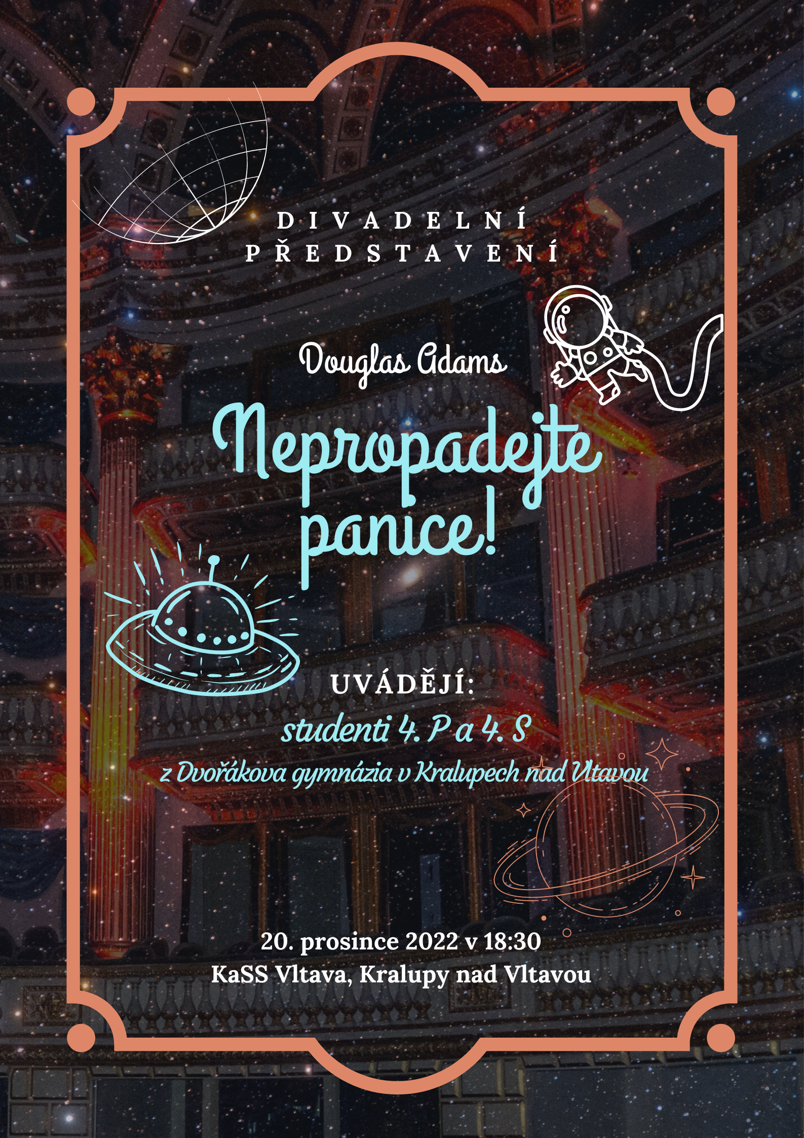 Vážení a milí profesoři, studenti, zaměstnanci, absolventi i příznivci školy, rád bych Vás za studenty 4. P a 4. S pozval na naše představení Nepropadejte panice!, které budeme hrát již podruhé. Tentokrát budeme hrát v úterý 20. 12. 2022, a to od 18:30 v KaSS Kralupy nad Vltavou. Zvaní jsou všichni, i ti, co představení už viděli a rádi by se na něj podívat ještě jednou. Budeme moc rádi, když si uděláte v předvánočním čase volno a necháte si ho zpříjemnit naším divadelním představením. Za divadelní soubor čtvrťáků Martin Elznic celý článek